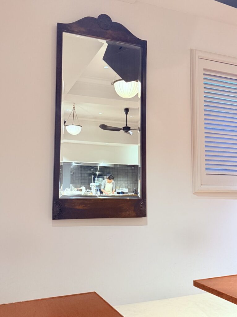 入口以外は外の景色が見えない「おこもり感」もこちらのカフェの魅力。アートや鏡、ウッドシャッターの存在が、かえって気持ちに豊かさを感じさせてくれます。自分の中に向かって気持ちを向けて過ごすのにぴったりな、濃密な時間が流れる場所。